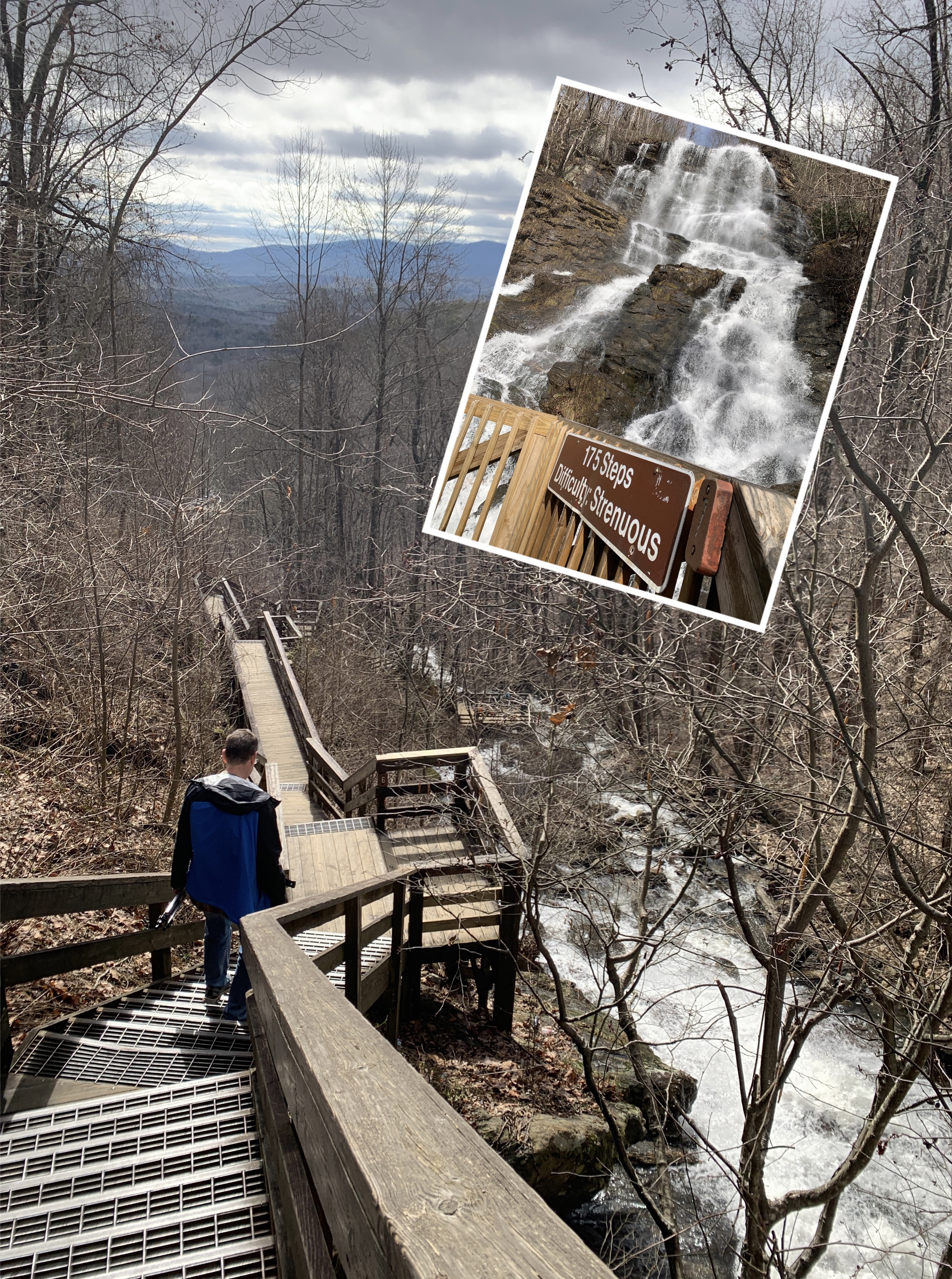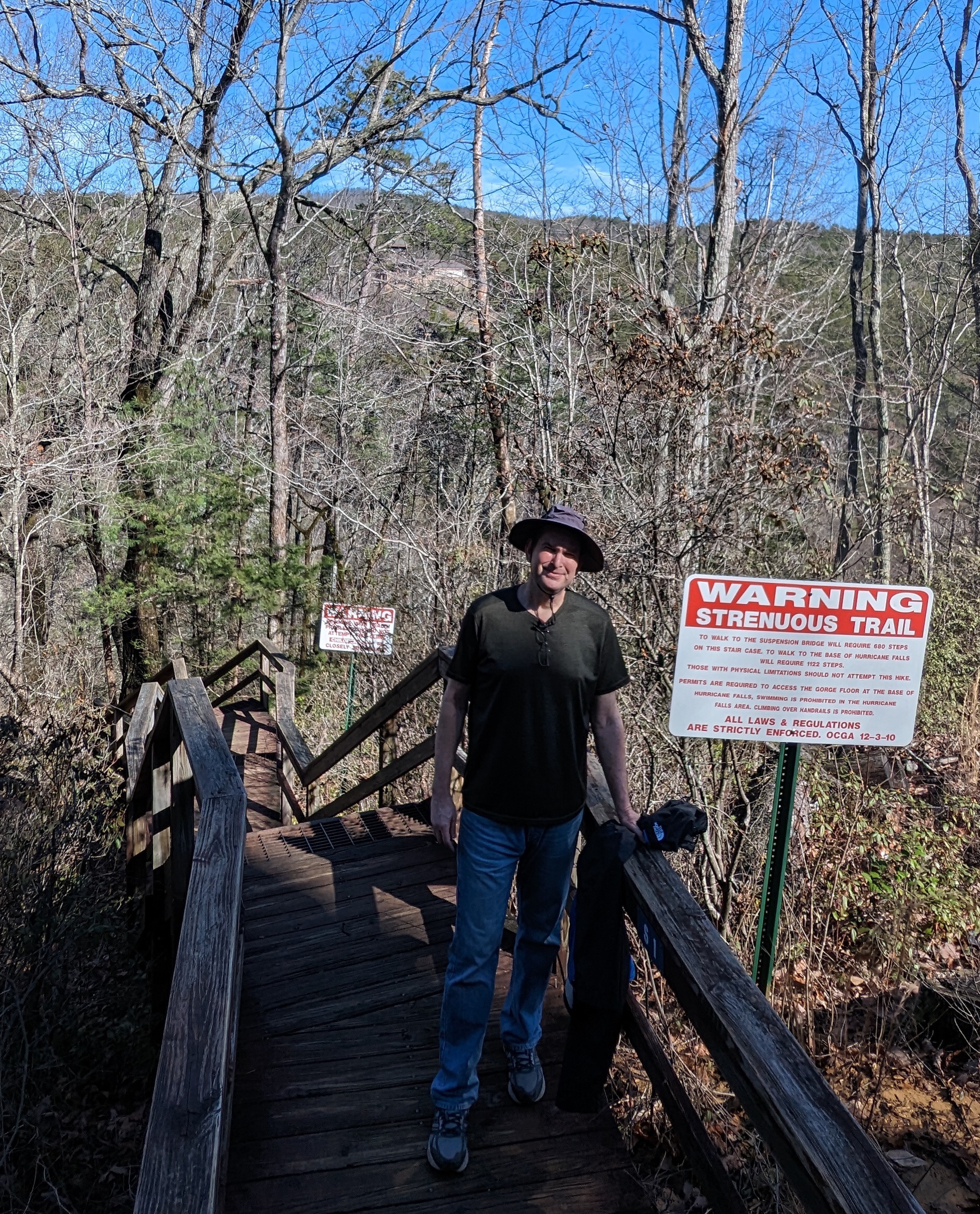We got to the Tallulah Gorge little after 10am. Not many people there at all. It was a nice hike around the rim, and down to the suspension bridge. Not as hard as I expected. But, it did have a strenuous trial warning sign for the 300 steps to the bridge. And of course, Erik needed a picture to show he did the steps.