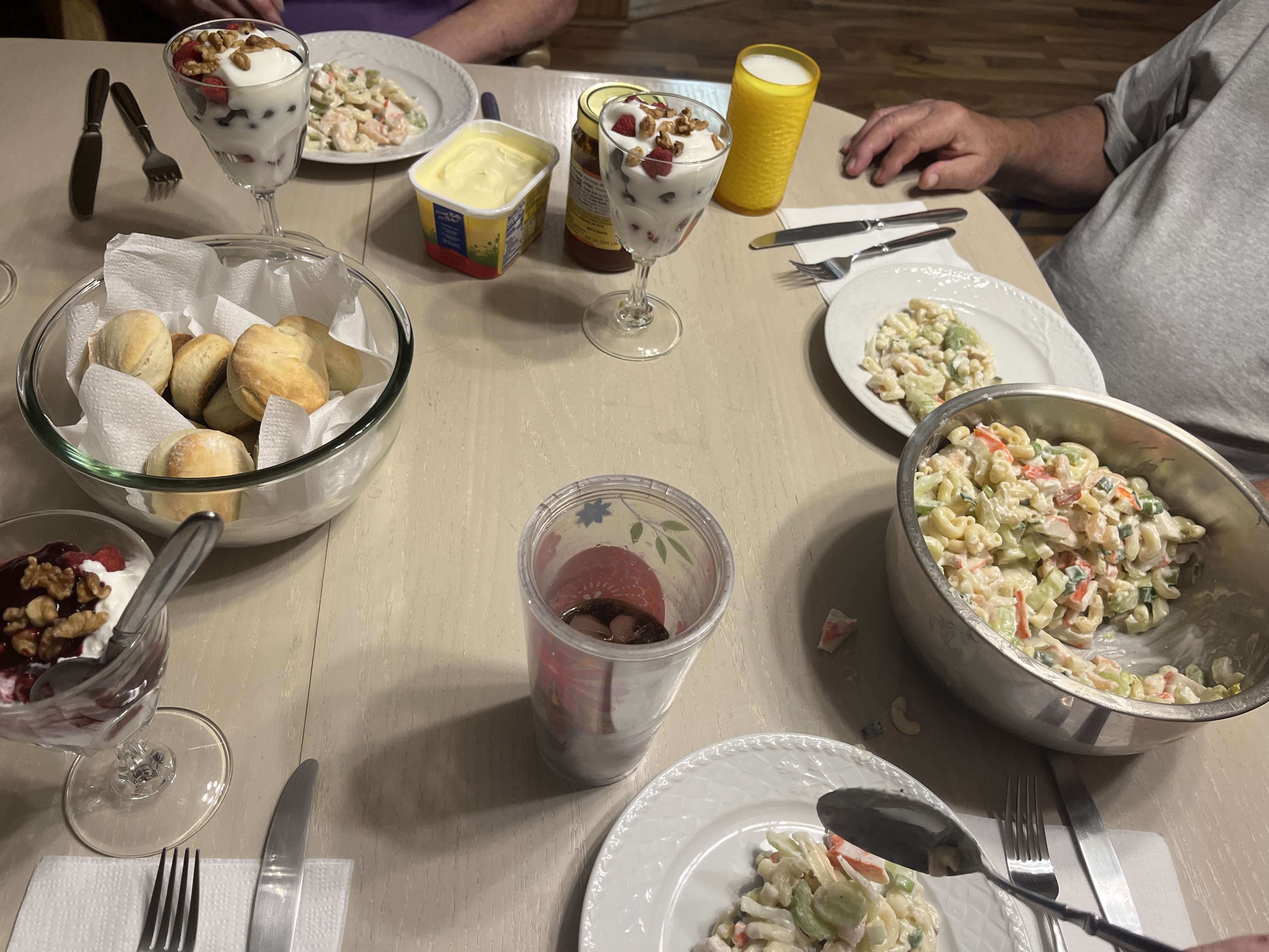 Our second day with mom and dad started with yummy egg hockey and some leftovers. I got to have more seafood salad and we cleaned out the blueberry cobbler 😍.