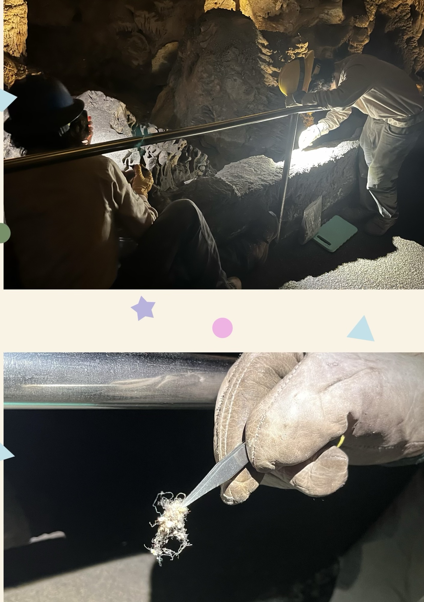 在山洞还看到美国国家志愿服务队的志愿者用镊子捡游客带进来的纤维,他们告诉我们纤维会影响洞内生态环境,损害石钟乳或是石笋。