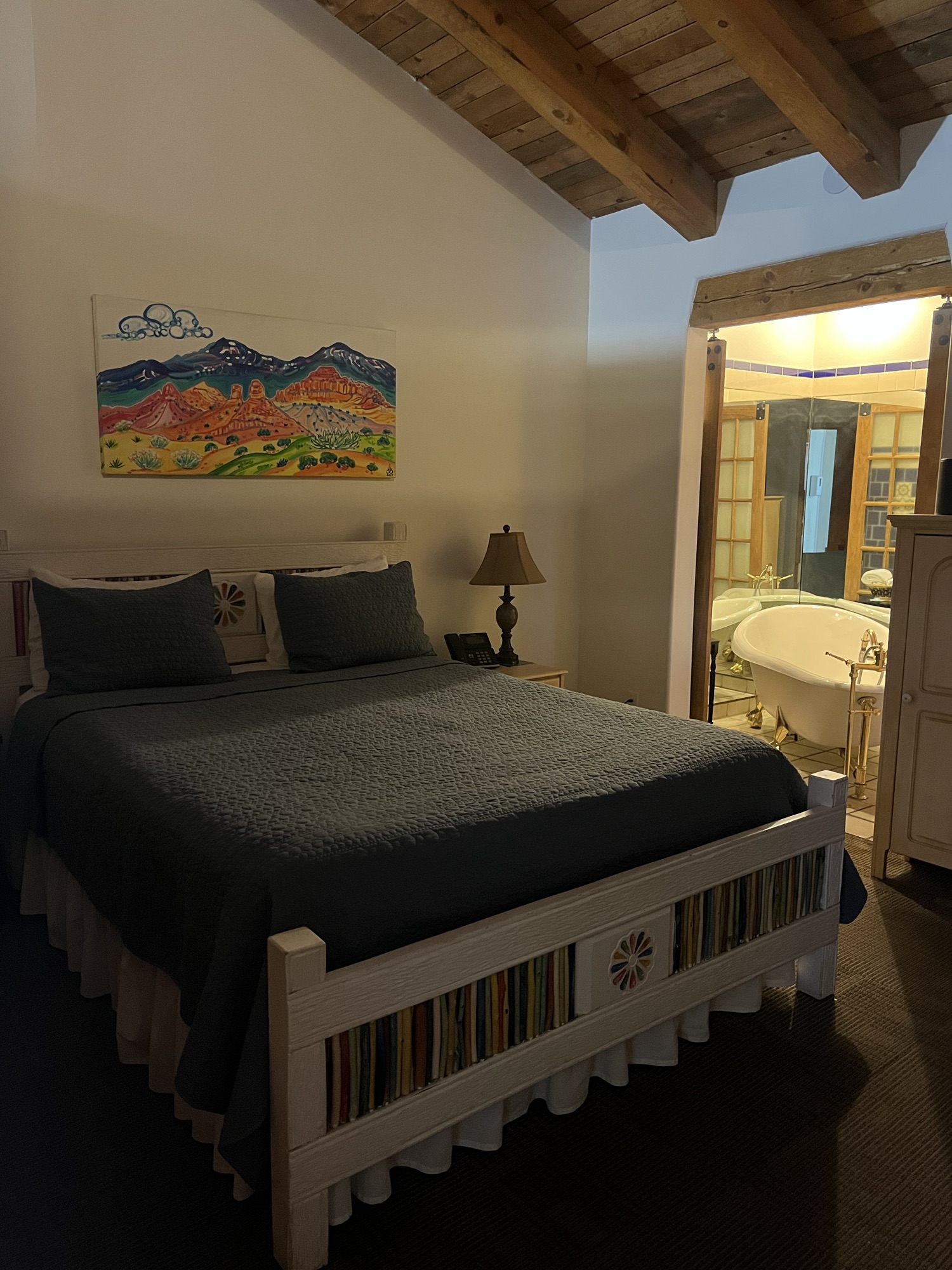 We drove 4 hours to Santa Fe. Same usual teamwork: Jeri drove and Erik looked for lodging. Look what he found. A nice lodge without modern shower. :) we probably need to hold the shower head for each other and be careful not to make a mess😜
