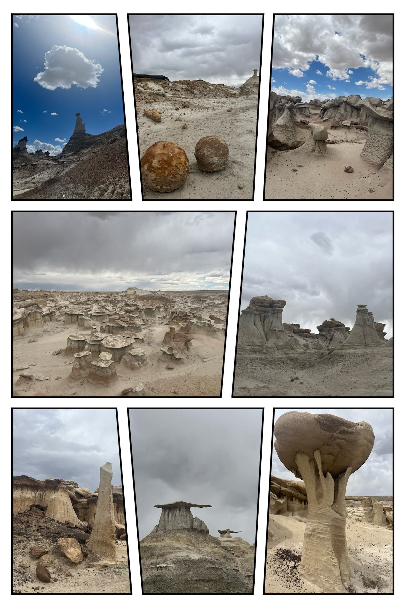 第二天无人区,选了两个徒步路线,都不错,非常喜欢!今天真的是无人,两个路线一个人也没见到,一共也是快10公里。看到吗?巨蘑、Bisti翅膀、恐龙蛋…
