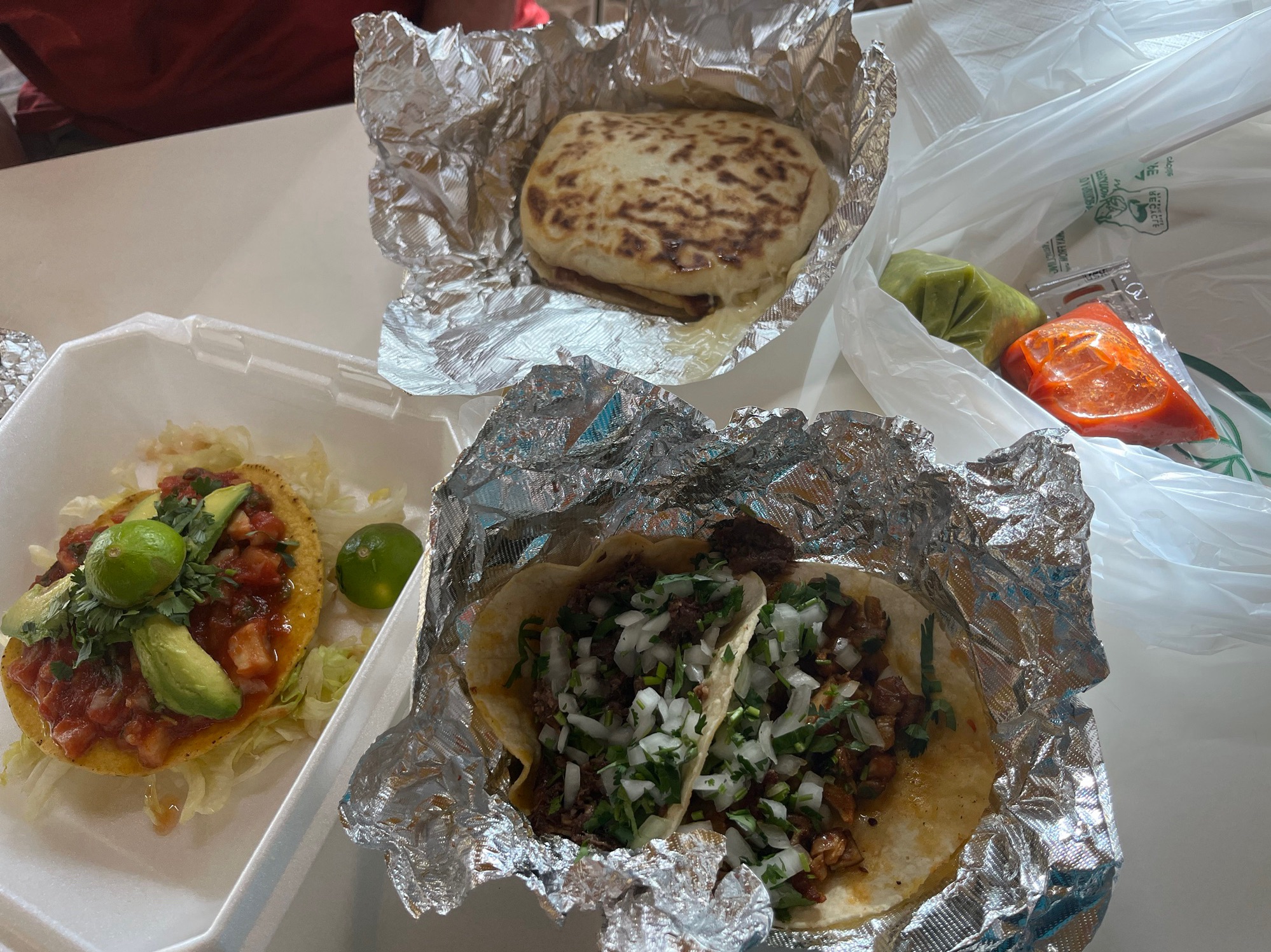 Guess what? Mexican food at Albuquerque after a day of rest. Beef head cheek taco, pork intestines taco, chili relleno, and tostadas de ceviche with fish. They were good.